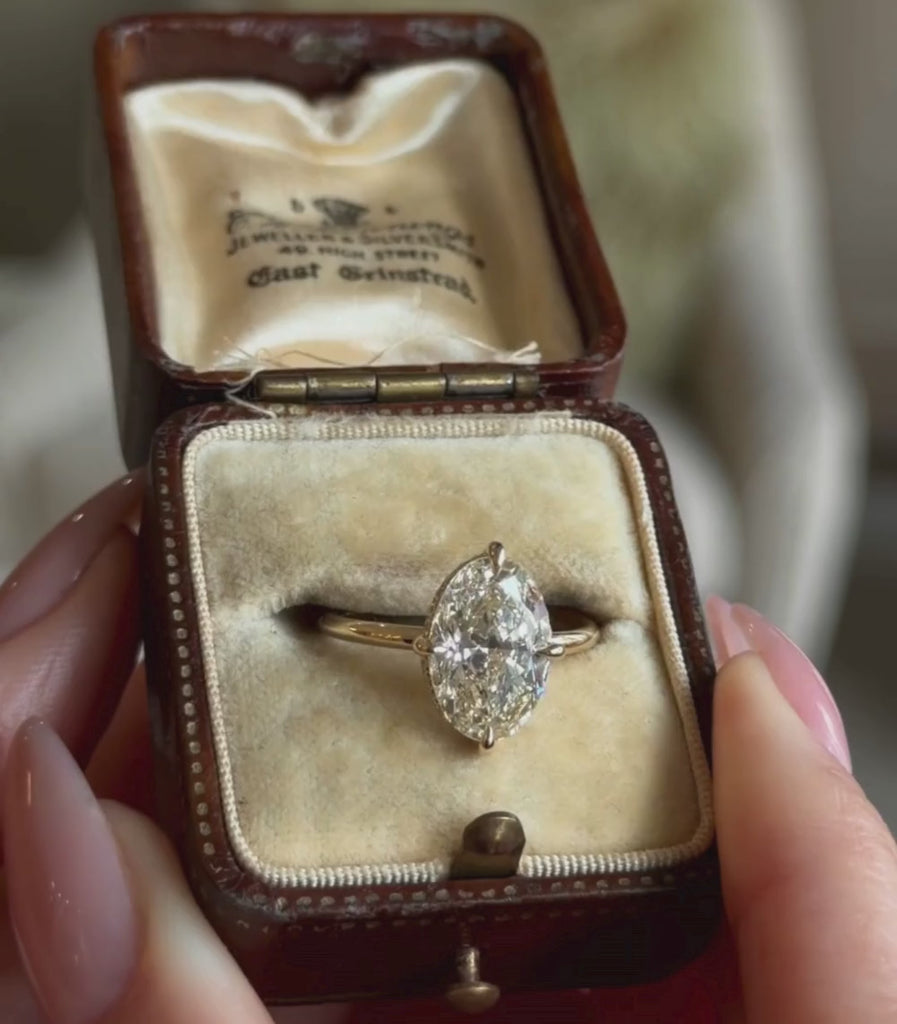 We’ve taken a most classic design, lowered the setting into the band, making it less exposed, while keeping the basket open for maximal visibility of the center stone. One incredibly beautiful 3.50ct Champagne Oval is set North-South on a simple round wire band that allows this contemporary piece to pair with almost anything in your wardrobe. Turn the ring to its side, and a sparkling row of white diamonds is exposed in the hidden halo.
