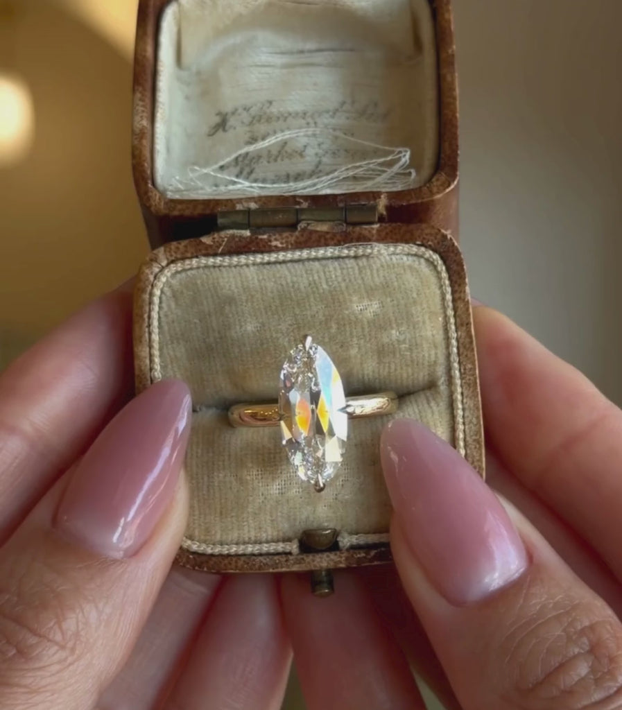 One stunning 3.85ct Lab Grown Antique style Elongated Moval shape diamond commands your attention with its gorgeous facet pattern and minimal four-prong setting. The seemingly floating diamond stays close to the hand, yet allows for endless stacking possibilities.