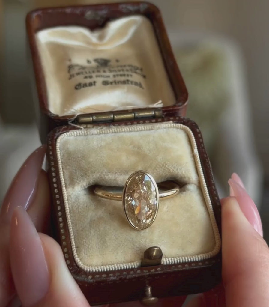One incredibly rich 3.02ct champagne Oval commands your attention in a glowing, delicate bezel. The oval shape is slightly elongated shape blending a Marquise and Oval cut. Featuring our signature U-shape band, this elongated Oval allows for seamless stacking and almost seems as though it's floating, nearly resting on your finger.