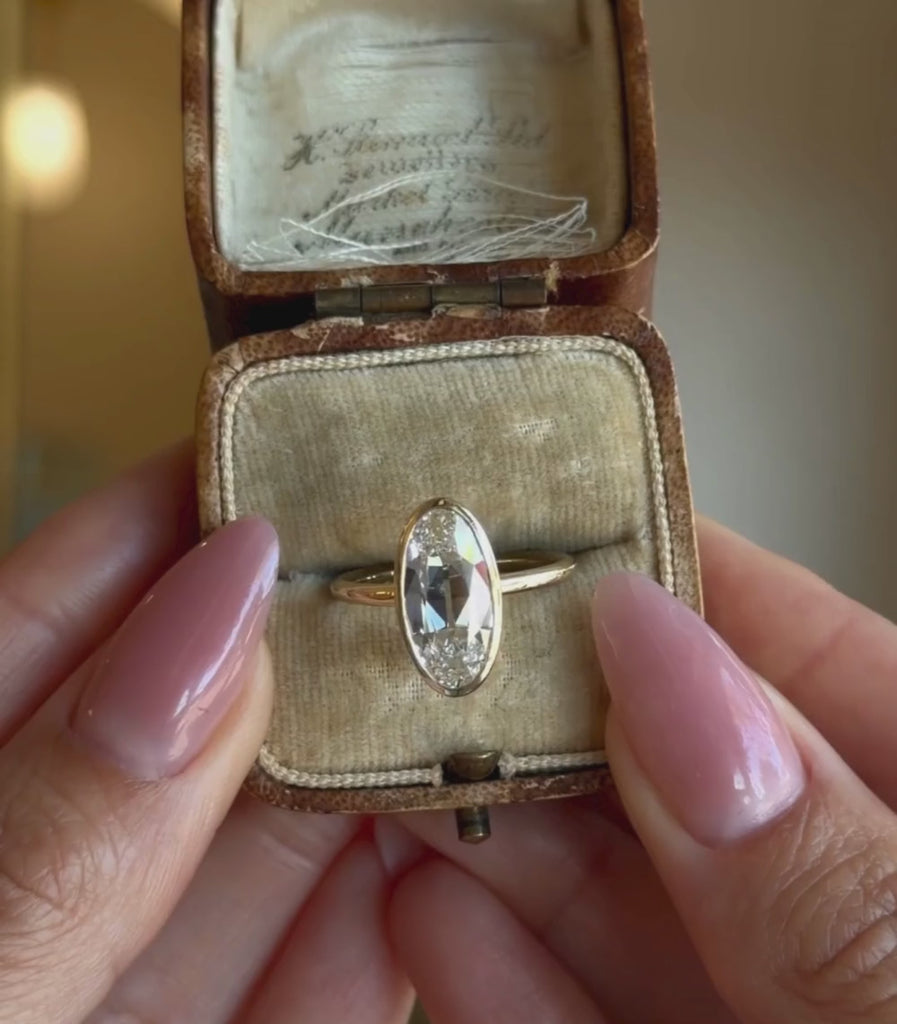 One incredibly stunning 3.01ct antique style lab grown Moval commands your attention in a glowing, delicate bezel. A Moval is an elongated shape blending a Marquise and Oval cut. Featuring the same shape and pattern seen in antique diamonds, this crisp beauty offers a perfectly elongated shape providing lovely finger coverage and making the ultimate stacking piece. The seemingly floating diamond stays close to you at all times, nearly resting on your finger.