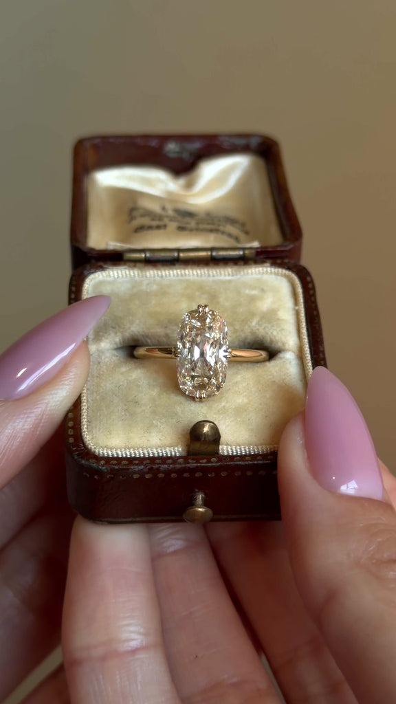 Featuring a 3.13CT elongated cushion-cut natural champagne diamond, she’s set north-south in a refined compass double-prong setting that highlights the stone’s elongated shape and luminous tone. The low-profile design allows the diamond to sit close to the finger, creating a soft, floating effect that feels both intentional and effortless.