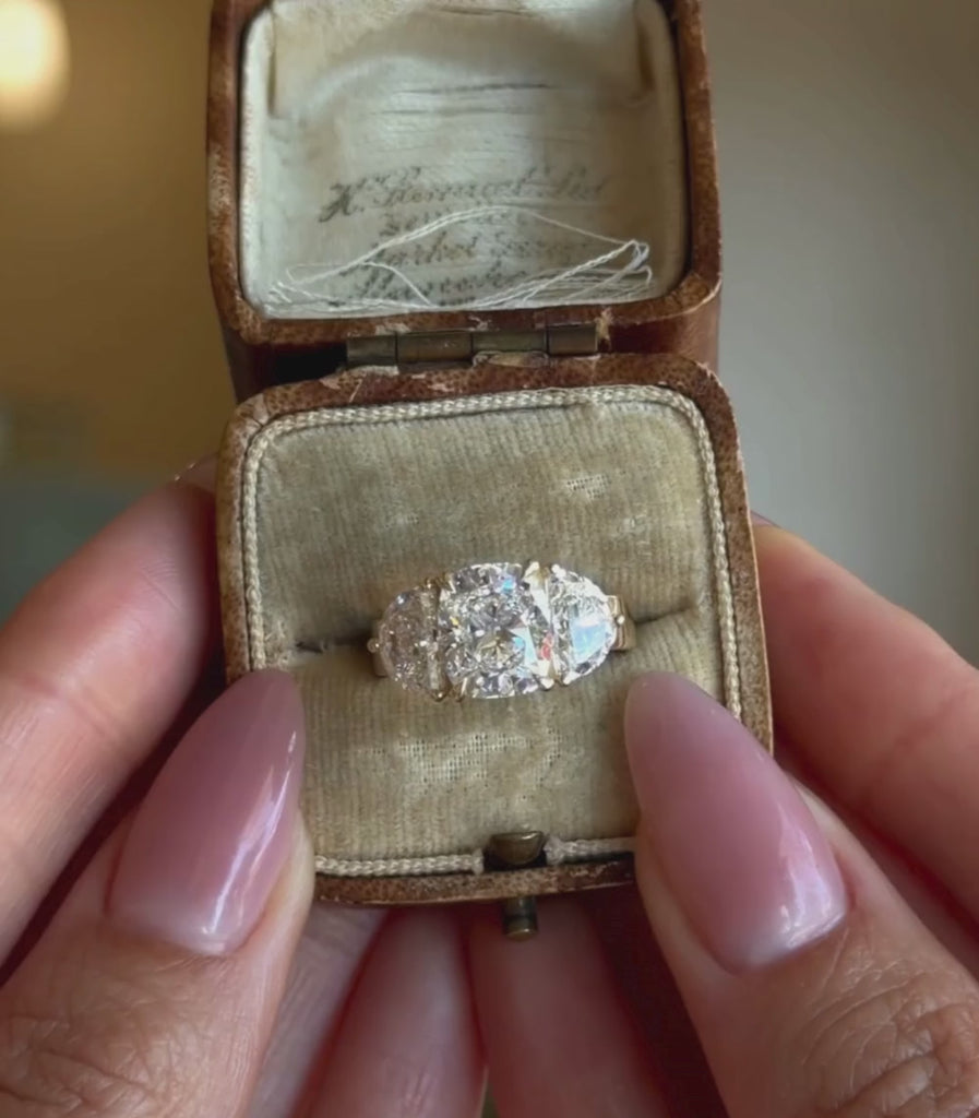 Sitting center pretty and center, a sparkling 2.81ct Brilliant Cushion. Flanking either side are nearly 1ct half-moons, almost creating the illusion of an elongated Oval, set East-West.