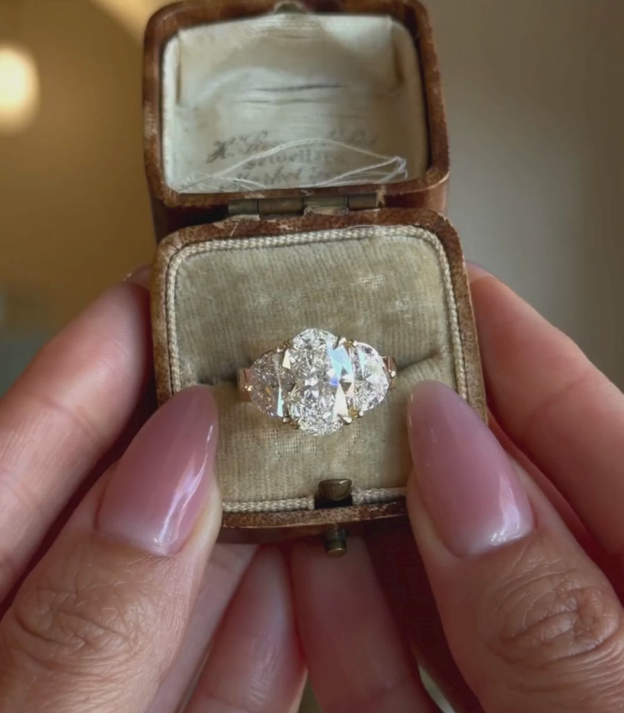Sitting center is a juicy and elongated Brilliant 3.07ct Oval. Flanking either side are half-moons, almost creating the illusion of one massive diamond. This variation of a Three Stone ring, while most classic, is the fresh take you've been looking for.