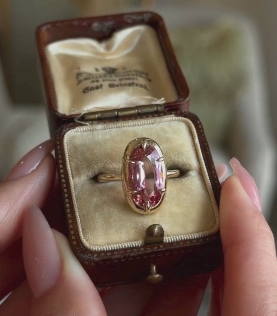 This Cora ring spotlights a richly saturated pink tourmaline, a jewel so vivid and luminous it feels like holding a sunset in your hand. Cut in an elongated oval with crisp facets and remarkable depth, this gem radiates warmth and just the right hint of drama.