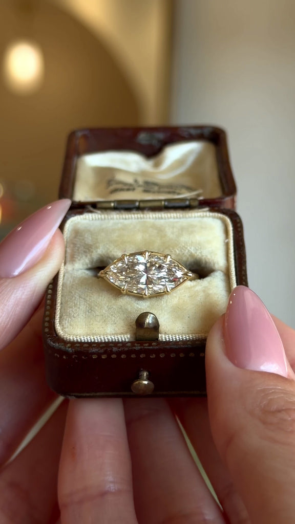 refined wire-frame basket keeps the silhouette airy and architectural, allowing the diamond’s broad facets to glow from every angle.