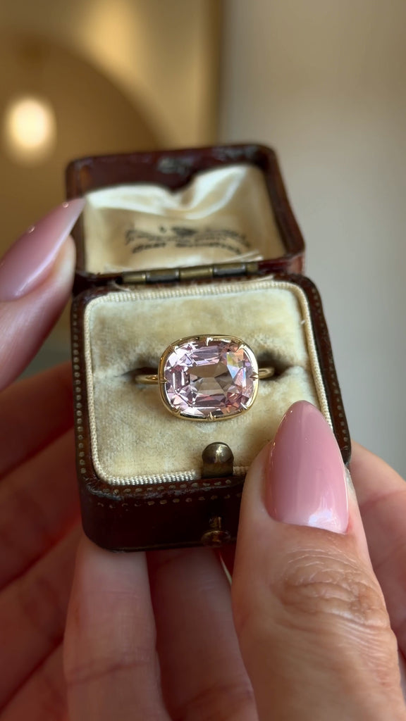 Centered around a luminous 4.52CT cushion-cut morganite in the dreamiest blush tone, she’s framed in warm gold with prongs that feel more like punctuation than structure. The result: a stone that glows from within, catching light in all the right ways.