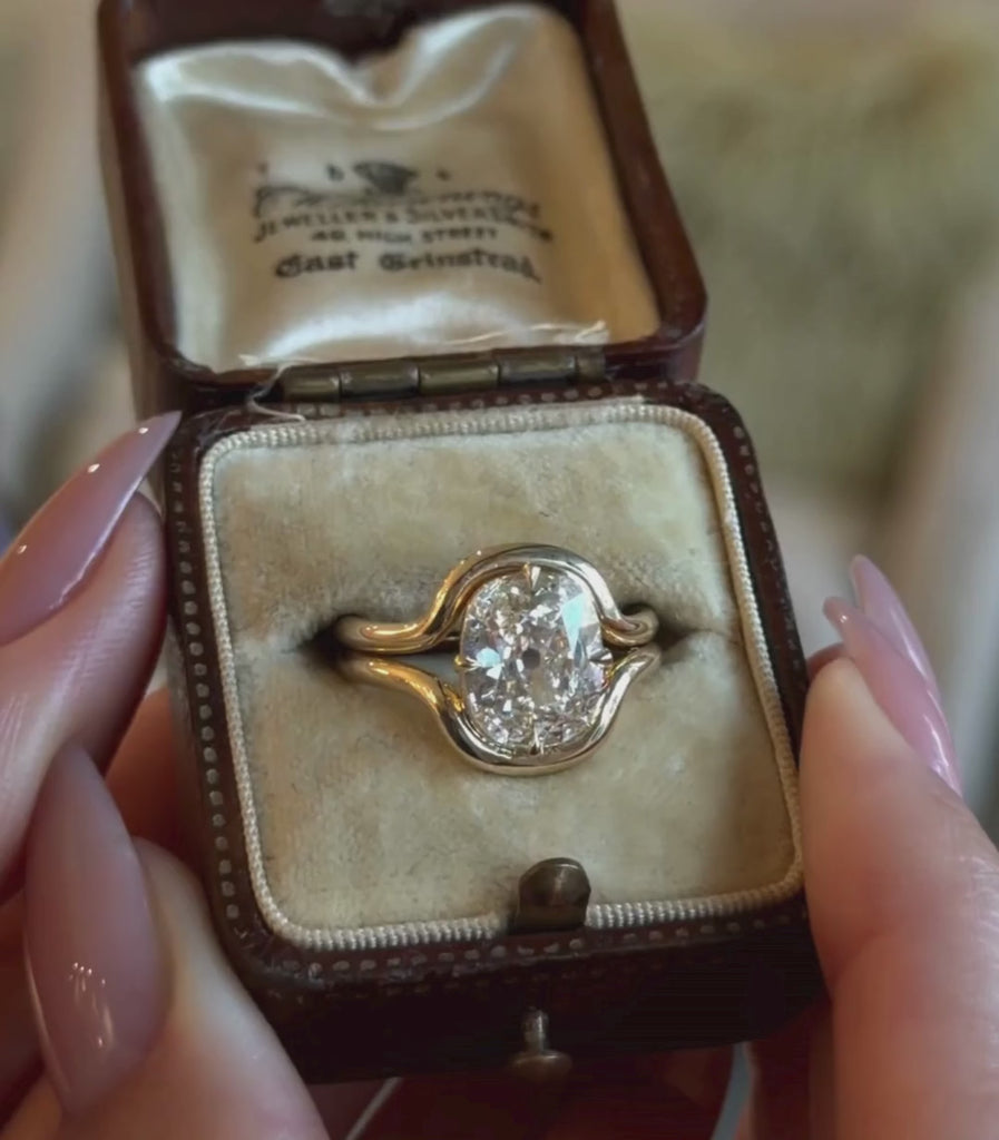 In fact, we loved the concept of stackability so much, we created the “convertible” option- meaning the double shank is actually two separate bands, which when stacked appear to be one ring- magic! Sinuous 14K yellow gold bands seamlessly wrap around the stone on either side, and continue to wrap around the finger. The center stone is a gorgeous and spready 2.31ct colorless, ultra-flat, cushion cut lab grown diamond. Not normally seen with these dimensions, this stone lies low to the finger and its subtle yet extraordinary facets.