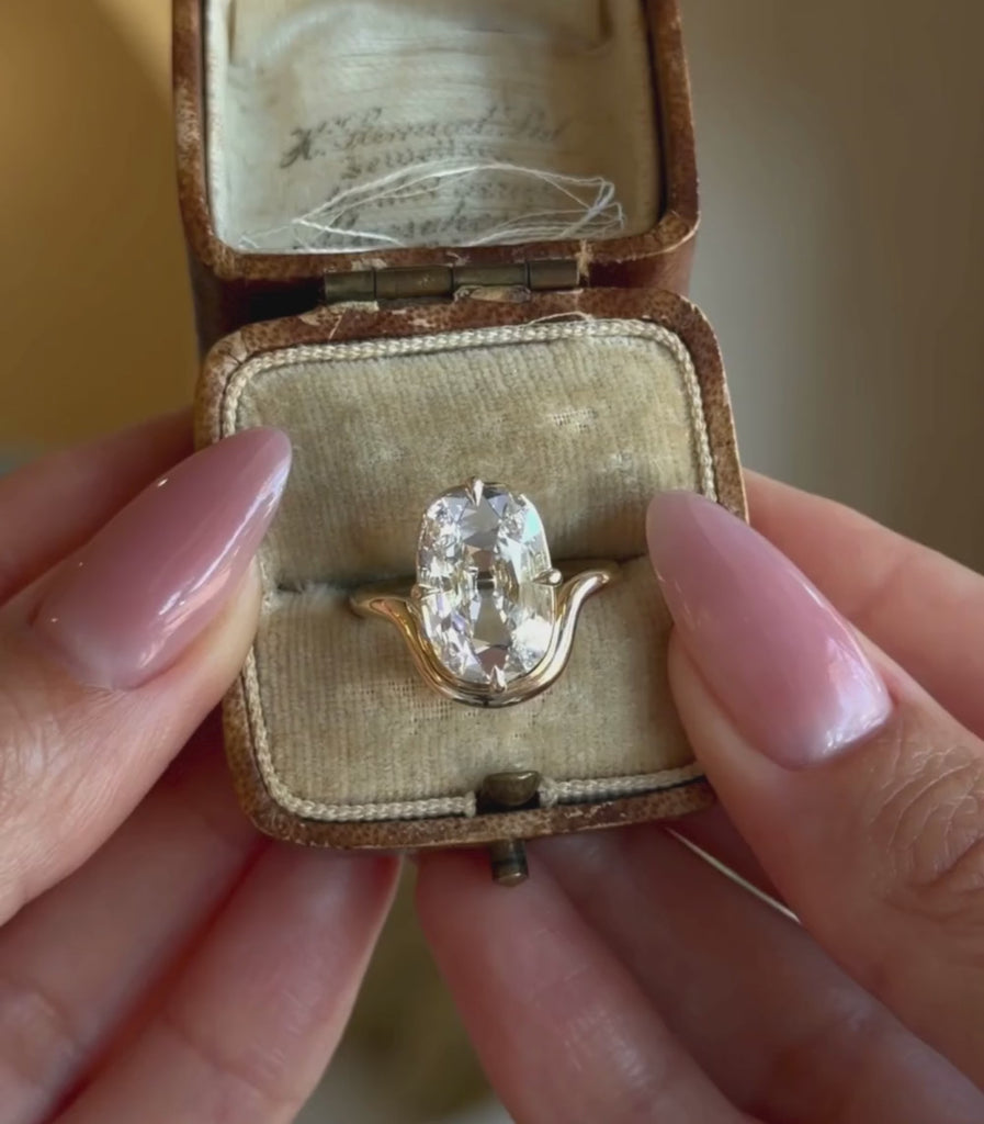 One sinuous 14K yellow gold bands seamlessly frames the 3.40ct flat antique style elongated cushion and continues to wrap around the finger. The center stone is truly a one of a kind wonder. Not normally seen with these dimensions, this stone lies low to the finger and its subtle yet extraordinary facets and the way light plays through the stone are reminiscent of a Rose Cut diamond.