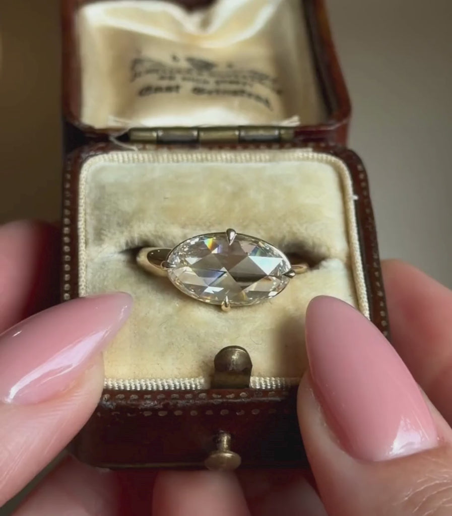 This unique ring features a sleek and romantic 2.24Ct Rose Cut lab grown Moval (cross between an oval and marquise) diamond, but the fun doesn’t stop there. She has a non-traditional band that wraps around in a snake-y fashion, tapering to the tip and leaving a slight opening for extra edge.