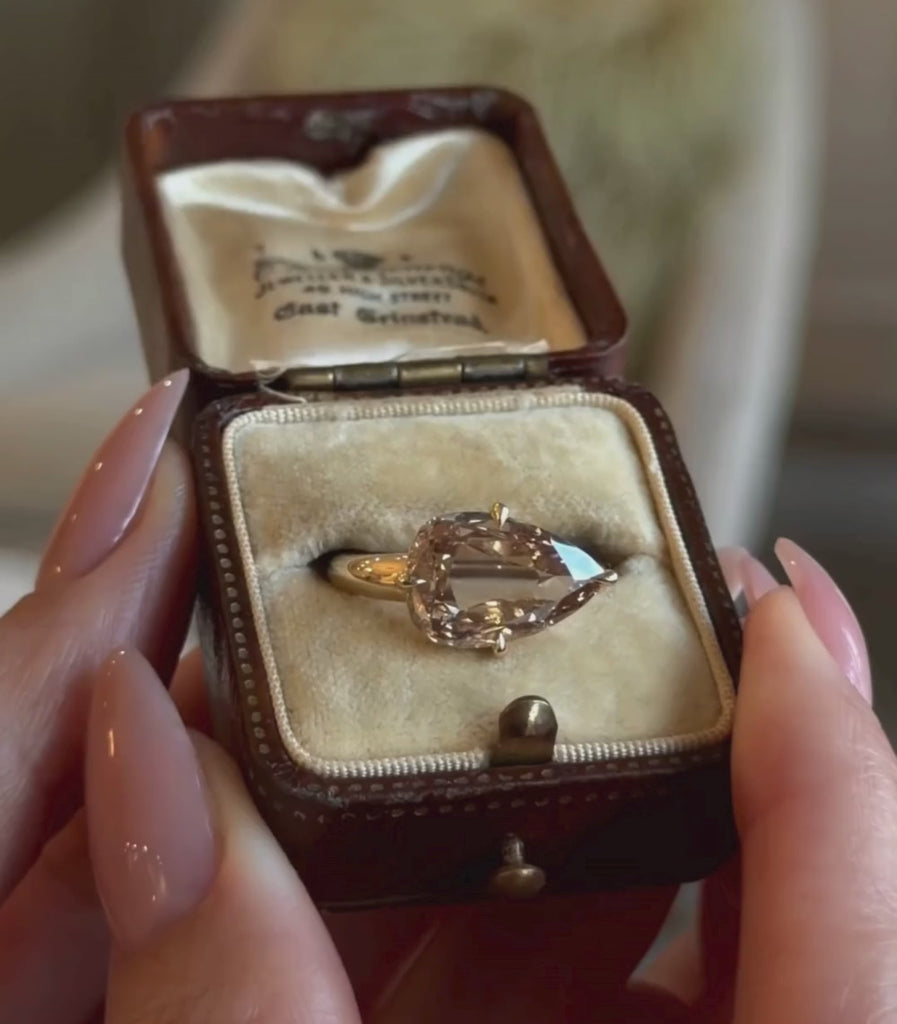 This unique and stunning center stone features a sparkling, extra-large and in charge 4.14ct Fancy Yellow Brown Rose Cut Pear diamond, but the fun doesn’t stop there. She has a non-traditional band that wraps around in a snake-y fashion, tapering to the tip and leaving a slight opening for extra edge.